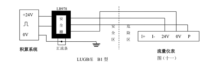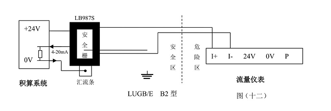 LUGB/E三線制脈沖輸出型渦街流量儀表與LB978齊納安全柵相連、LUGB/E兩線制標準4~20mA電流輸出型渦街流量儀表與LB987S齊納安全柵相連可構成本質安全型防爆系統,產品防爆標志為Ex ia Ⅱ CT2-T5。本安防爆型渦街流量傳感器/變送器與防爆安全柵和積算系統等關聯設備的接線性請參看防爆安全柵廠家提供的接線說明和以下所示圖(十一),圖(十)。